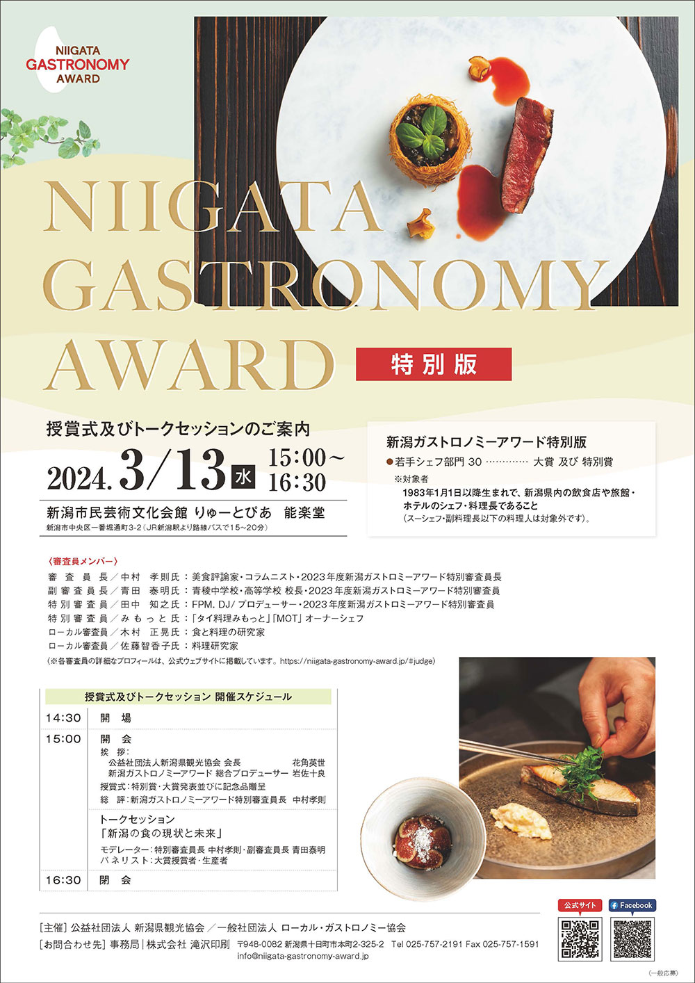 ニュースNews 2026年ニュース 2024年ニュース 2023年ニュース トップに戻る 2024.03.07 大賞・特別賞 授賞式及びトークセッションの情報をアップしました。 新潟ガストロノミーアワード特別版 授賞式及びトークセッション 日 時 2024年3月13日(水) 会 場 新潟市民芸術文化会館りゅーとぴあ 能楽堂 (新潟市中央区一番堀通町3-2) 時 間 14:30 開場 15:00 開会 大賞・特別賞授賞式 トークセッション 16:30 閉会(予定) *注意事項 ・会場までの交通費等は自己負担となります。 ・会場の駐車場料金は自己負担となります。 ・場内ではスタッフの誘導にご協力ください。 ⇒ PDFはこちら トップに戻る