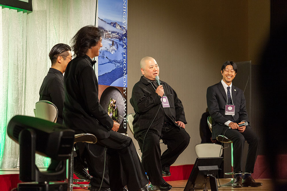 【セッション1】はグランプリ獲得者インタビュー。内山農園・内山徳寿さんと、登喜和鮨・小林宏輔さんのグランプリ獲得者のお2人をパネリストに迎え、青田副審査員長と中村審査委員長のお2人がモデレーターとなってトークセッションを行いました。